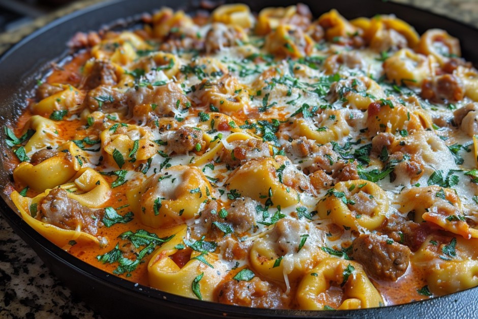 Tender tortellini with Italian sausage in creamy tomato sauce, finished with melted mozzarella and herbs.